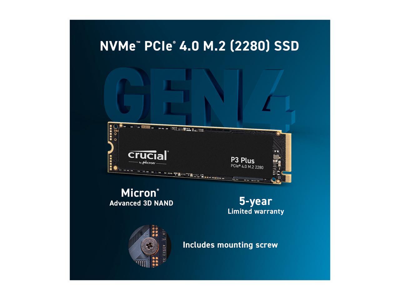 Valuable Gen4 performance is here. Introducing the Crucial P3 Plus Gen4 NVMe SSD, delivering impressive speed with sequential reads/writes up to 5000/4200MB/s. Including dynamic write acceleration and adaptive thermal protection to keep your data safe while enhancing system reliability, the P3 Plus is the NVMe storage solution professionals, creatives, gamers, and other high-performance users need. Engineered by Micron with the latest Gen4 NVMe 3D NAND technology, the Crucial P3 Plus comes in generous capacities and offers flexible backward compatibility for most Gen3 systems.