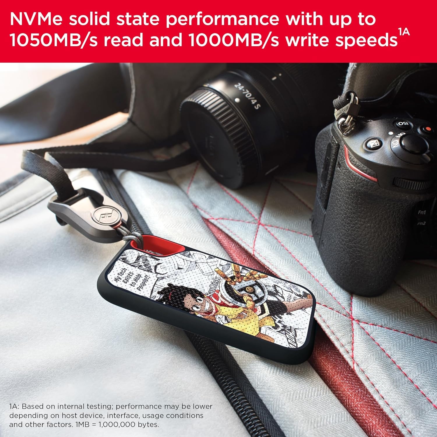 Your lifes an adventure. To capture and keep its best moments, you need fast, high-capacity storage that accelerates every move. 1050MB/s read and 1000MB/s write speeds let you store your content and creations on a fast drive that fits seamlessly into your active lifestyle. Up to two-meter drop protection (3), with IP55 water and dust resistance (3), a carabiner loop for securing the drive. From the brand trusted by professional photographers, the SanDisk Extreme Portable SSD provides fast solid state performance in a tough, reliable storage solution. 1GB = 1,000,000,000 bytes, 1TB = 1,000,000,000,000 bytes. Actual user capacity less. Up to 1050MB/s read speed, up to 1000MB/s write speed. Engineered with proprietary technology to reach speeds beyond UHS-I 104MB/s, requires compatible devices capable of reaching such speed. Based on internal testing; performance may be lower depending on host device, interface, usage conditions and other factors. 1MB=1,000,000 bytes. (1) See official SanDisk website. (2) Password protection uses 256-bit AES encryption and is supported by Windows 8, Windows 10 and macOS v10.9+ (Software download required for Mac, see official SanDisk website.) (3) Based on internal testing. IPEC 60529 IP 55: Tested to withstand water flow (30 kPa) at 3 min.; limited dust contact does not interfere with the operation. Must be clean and dry before use.