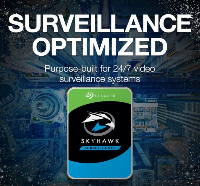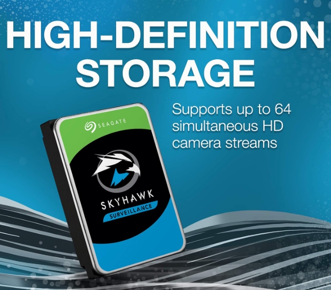 **Seagate Skyhawk 4TB Video Internal HDD (ST4000VXZ16/016):** Optimized for 24/7 surveillance systems, this 3.5-inch SATA 6Gb/s hard drive delivers 4TB storage, 64MB cache, and high workload rates for seamless DVR/NVR performance. Features Drive Health Management to preempt failures, ensuring reliability in continuous operation. Unique in-house Rescue Services offer data recovery support, minimizing downtime. Built for security cameras with enhanced vibration resistance and compatibility, it balances endurance, capacity, and data protection for critical video workloads.