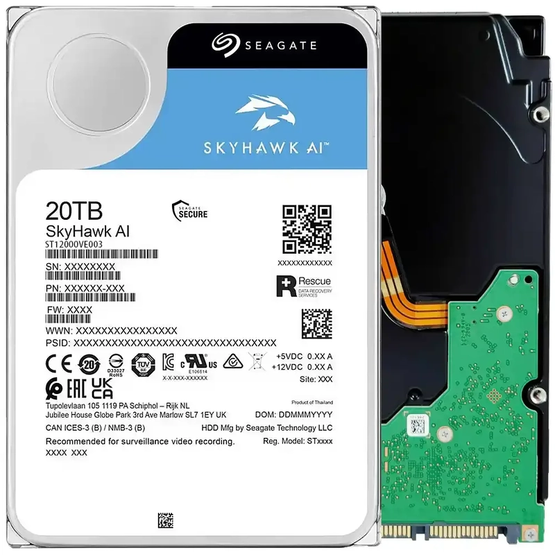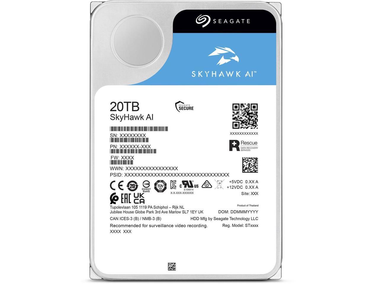**Seagate SkyHawk AI 20TB SATA III 3.5?? HDD (ST20000VE003):** Designed for AI-driven surveillance systems, this 20TB hard drive combines massive storage with high-performance 7200 RPM speeds and SATA III efficiency. It supports up to 64 HD cameras and 32 AI streams, optimized by ImagePerfect AI firmware to minimize frame loss during intense activity. Built for 24/7 operation, it features RAID compatibility, 2M-hour MTBF reliability, and includes Rescue Data Recovery Services for critical data protection. Ideal for demanding surveillance environments, it ensures seamless, high-capacity storage with AI-enhanced durability and recovery assurance.