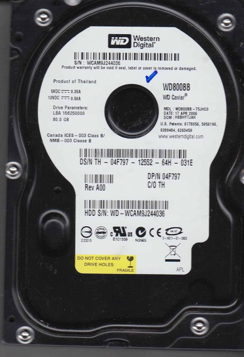 WD800BB-75JHC0, DCM HSBHYTJAH, Western Digital 80GB IDE 3.5 Hard Drive