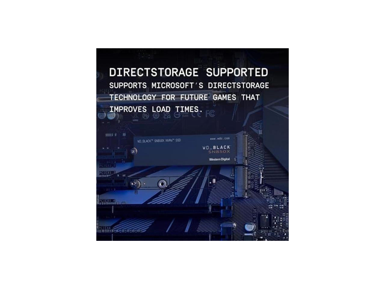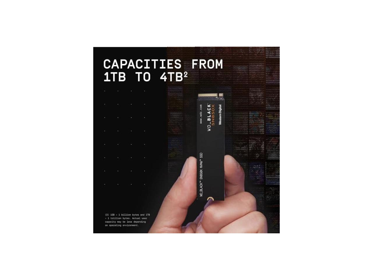 Strap in for breakneck gaming speeds with the WD_BLACK SN850XNVMeSSD. Crush load times and slash throttling, lagging, and texture pop-ins for asmooth, fast experience that lets you compete at your absolute peak. Thispurpose-built gaming drive comes in capacities of 1TB to 4TB(2), with anoptional heatsink on the 1TB and 2TB drives to help sustain top-endperformance for more consistent gameplay. With the advanced features ofGame Mode 2.0 (Windowsonly) automatically turned on by the WD_BLACKDashboard and supporting Microsoft’sDirectStoragetechnology, theWD_BLACK SN850XNVMeSSD delivers top-tier performance to keep youplaying, streaming, recording, and dominating the game. (2) 1GB = 1 billion bytes and 1TB = 1 trillion bytes. Actual user capacitymay be less depending on operatingenvironment.