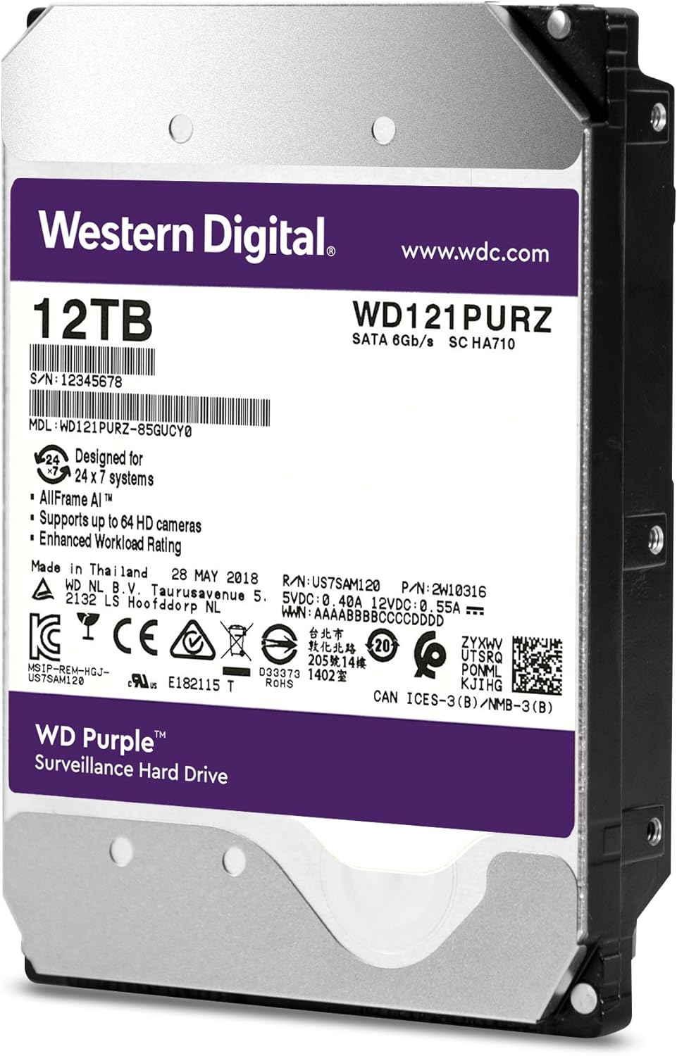WD Purple WD121PURZ 12TB 7200 RPM 256MB Cache SATA 6.0Gb/s 3.5″ Internal Hard Drive Bare Drive