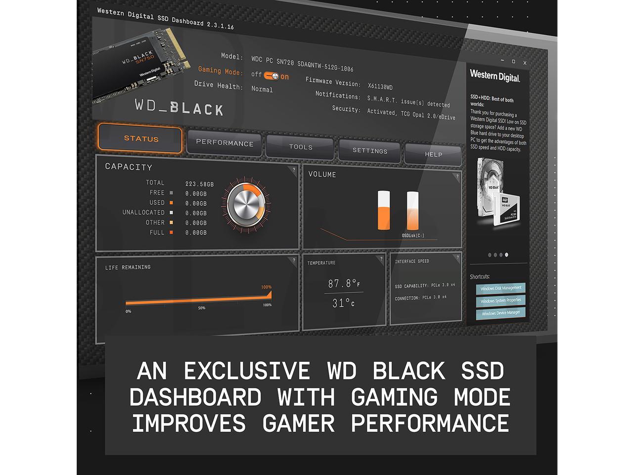 | Features | An exclusive WD BLACK SSD dashboard with gaming mode improves game performance., Available in capacities ranging from 250GB to 4TB., Endurance: 2 400TBW, Read speeds up to 3 400 MB/s for improved load times. |